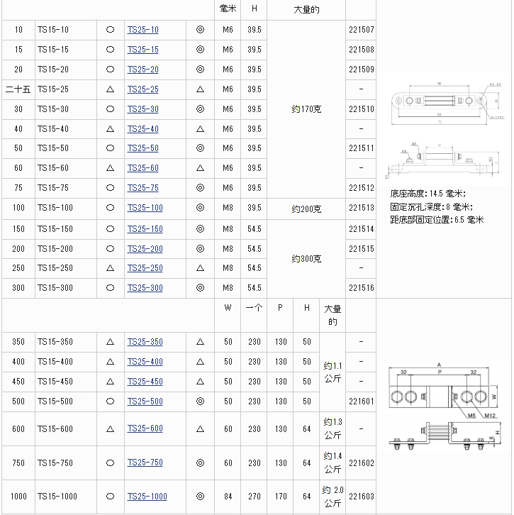TS25 系列(TS15、TS16 和 TS26 系列通用)0.5A 至 300A 的底座分流器的底座安裝尺寸為:(底座高度:14.5mm,固定沉孔深度:8mm,固定位置距底部:6.5mm。